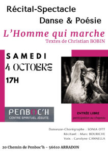 • 14h00 :  Rencontre avec les artistes Sonia Ott et Marc Bouriche à la suite de leur récital de danse-poésie donné à Penboch le Samedi 4 Octobre à 17H. Cette rencontre sera l’occasion d’échanger sur le parcours de vie de ces deux artistes guidés par leur Foi et l’amour de l’art.